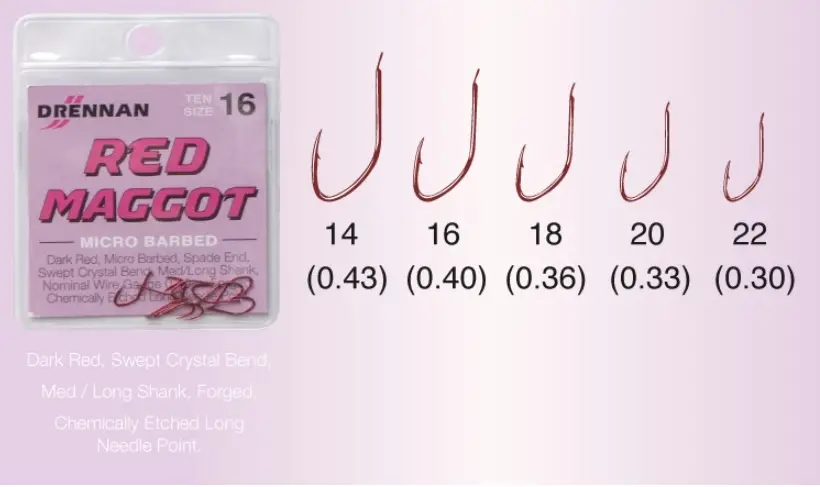 Drennan Red Maggot с  тъмночервения си цвят и специална ромбовидна извивка - ,,Червеният магьосник'' е проектиран да позиционира стръвта в оптимално положение под бода  на куката. Куката е кована , което я прави изключително здрава и надеждна въпреки ,че е сравнително тънка а чистия край на лопатката гарантира, че няма да нарани влакното ви и кара куката да пропада максимално естествено във водата .Най-често се ползват при риболов на капризни риби с финна стръв , като вердевас ,тънък торен червей, един бял червей или пинки .