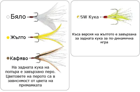 Повърхностна примамка, която много лесно се води от страна на страна (техниката Walk the Dog), създавайки големи балончета, пръски и заслепителни отблясъци. Обемът на тялото, заострената форма в опашната част и чашковидната лопатка съдействат за отличен кастинг. Куката на опашката е оборудвана с ламе и пера в жълт, кафяв или бял цвят в зависимост от цвета на попъра.