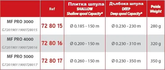 MF PRO (MF: Match / Feeder) се предлага в 3 размера: 3000/4000/5000 и включва 2 шпули: 1 плитка ( за плетено влакно ) и 1