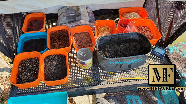 Един пакет Kim Dark Etang 1kg, един пакет Feeder DARK 1kg, една четвърт TTX Fijn 1 kg, една четвърт Big Fish Mix 1kg и половин бутилка „BIG FISH/ orange / (FRUIT-SCOPEX)“ Fructaline Liquiq 500ml. Етангът е със средна структура и много трохи в него. Те прекрасно задържат по-големите риби на петното. Фидер дарк си е специализирана захранка за риболов с фидер и пасва идеално за концепцията. TTX e царевично кюспе със страхотен аромат, на който почти никоя риба не може да устои. По принцип поема много вода, можете да го накиснете преди добавянето или да овлажните захранката на няколко пъти. Биг фиша е също сладка храна, която е насочена към риболова на по-големи шарани, каракуди и платики. Последният компонент от нашия микс е ароматизаторът с високо съдържание на захари FRUIT-SCOPEX. Освен, че добавя неустоим аромат на захранката той убива част от много активните малки частици, които пречат когато има много дребни риби. Такъв е случаят и на канала където има милиарди уклеи. Освен това имахме и глина GOREK Double Leam 2kg Natural, с която можехме да обедним храната при нужда или да подаваме само глина, скълцан торен червей, семена и т.н. според случая. Глината се пресява през ситно сито и след това се овлажнява с пулверизатор и бъркалка. Бърка се и се пръска до постигане на желаната влажност. Тя е такава, че когато я стиснеш трябва да става на топка, която след това можеш да разбиеш без усилия.