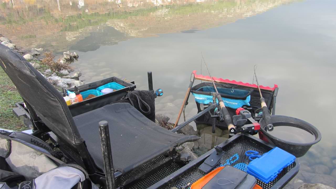 Бях позициониран в средата на контра стената . Това ми позволяваше да ловя както в плиткия участък, така и в по-дълбокия. Разпънах две въдици за да имам повече опции от към проба на дистанция , стръв и храна. ITALICA Aria Feeder 3pcs 3.96m 60gr и SERIE WALTER Racer Feeder 330LQ с макари PRESTON Magnitude 520 .