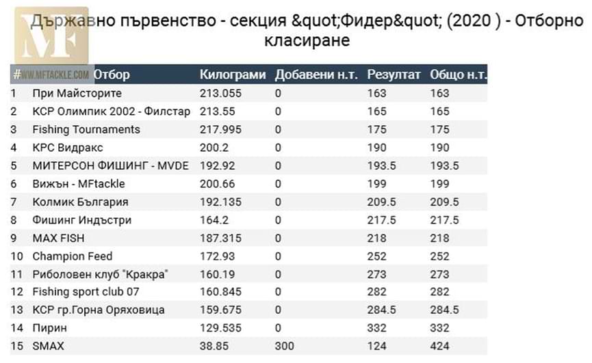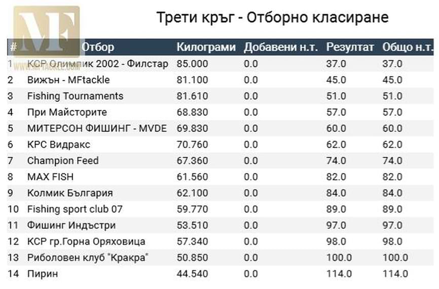 Борбата за републиканската титла отборно беше оспорвана до последно. В крайна сметка се реши с две наказателни точки по-малко в полза на При Майсторите, втори останаха КСР Олимпик 2002 –Филстар, трети Фишинг Турнаментс.