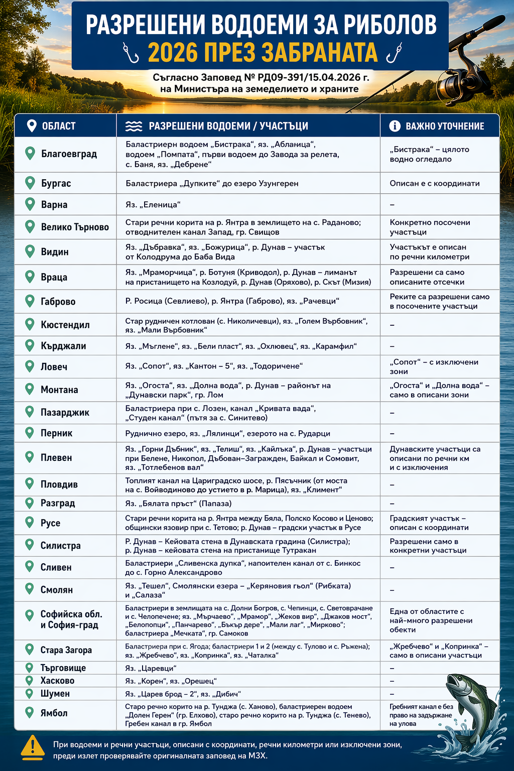 Разрешени водоеми за риболов 2026 през забраната е темата, която всяка пролет започва да вълнува хиляди риболовци в цялата страна. През 2026 г. режимът е уреден със Заповед № РД09-391/15.04.2026 г., а по информация на Министерството на земеделието и храните забраната обхваща Черно море, река Дунав и вътрешните водоеми в България, като едновременно с това са определени и конкретни обекти, в които любителският риболов остава разрешен по време на забранителния период.