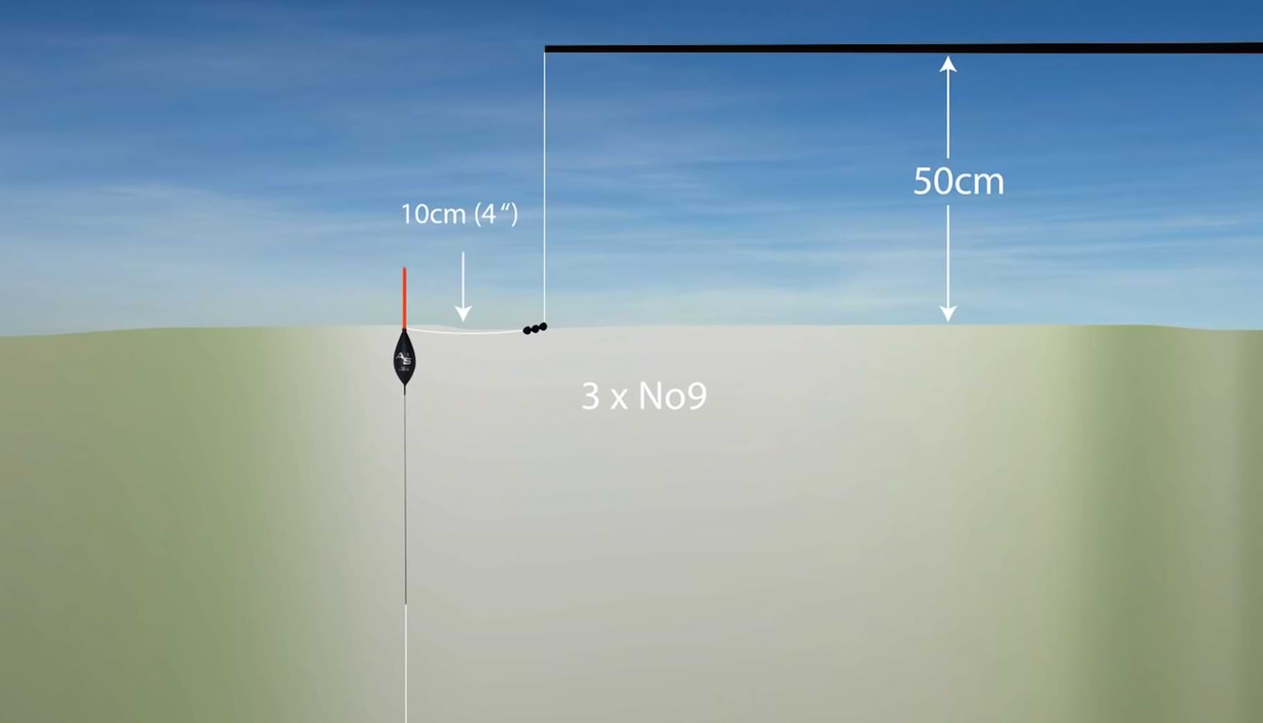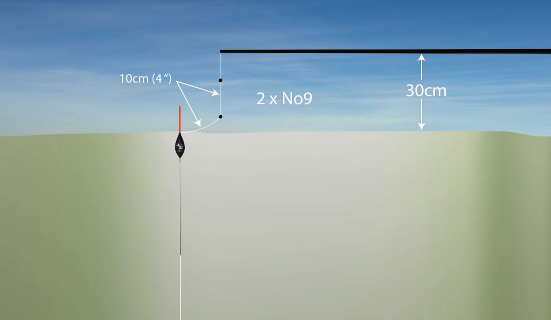 При слаб вятър Alan Scotthorne построява своята линия така ,че между плувката и върха на щеката да има 30 см. влакно . На 10 см. от плувката поставя една сачма номер 9 и след още 10 см. поставя втора сачма номер 9.
