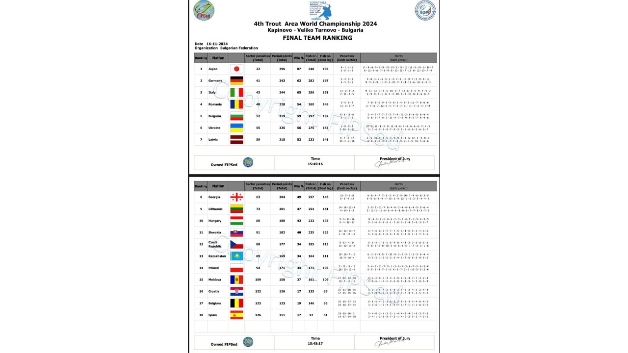 Българският отбор завърши на престижното пето място в отборното класиране – постижение, което утвърди страната ни като значим фактор в световния спортен риболов по Trout Area риболов. Нашите риболовци показаха отлична подготовка, стратегическа гъвкавост и борбеност, съревновавайки се с най-добрите в света.
