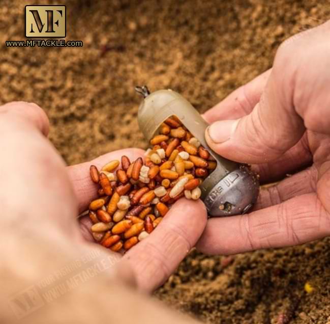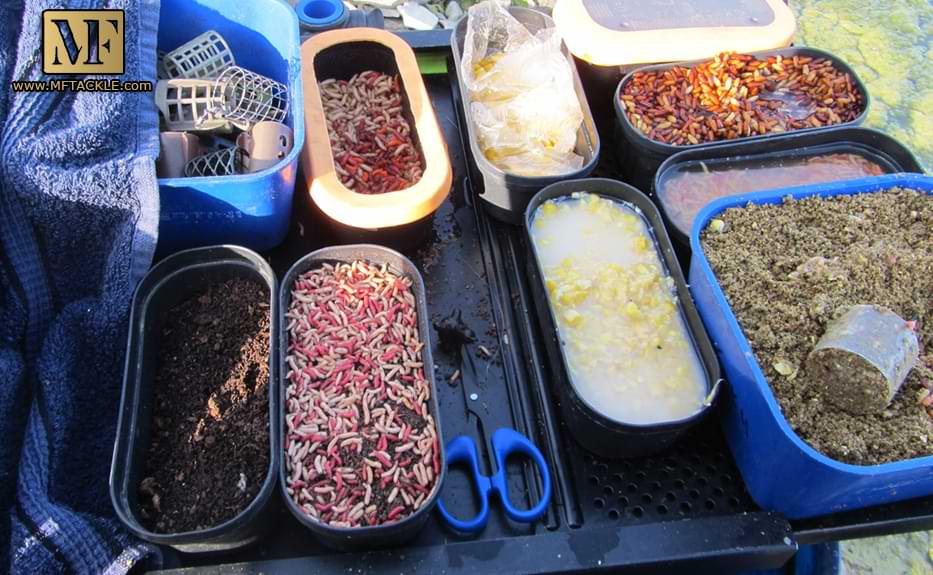 Кастери, царевица, удавени червеи, пинки, бял-шарен червей , кълцана царевица, ножица, хранилки и поводи.