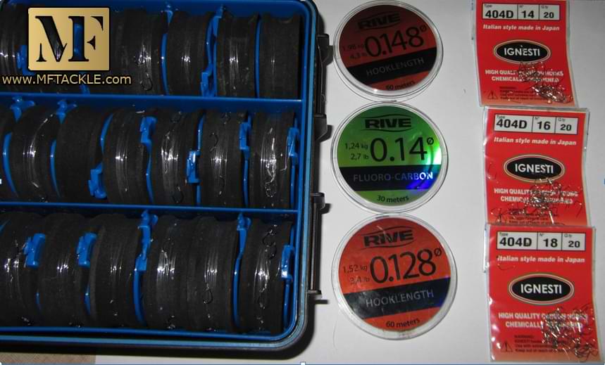 18 номер вързах с 0,128, 16 с 0,14 флурокарбон и 14 с 0,148. Аз лично, връзвам поводите по на 60 см. Ако се налага по-дълъг повод добавям удължител от по-дебело влакно – примерно 0,20.