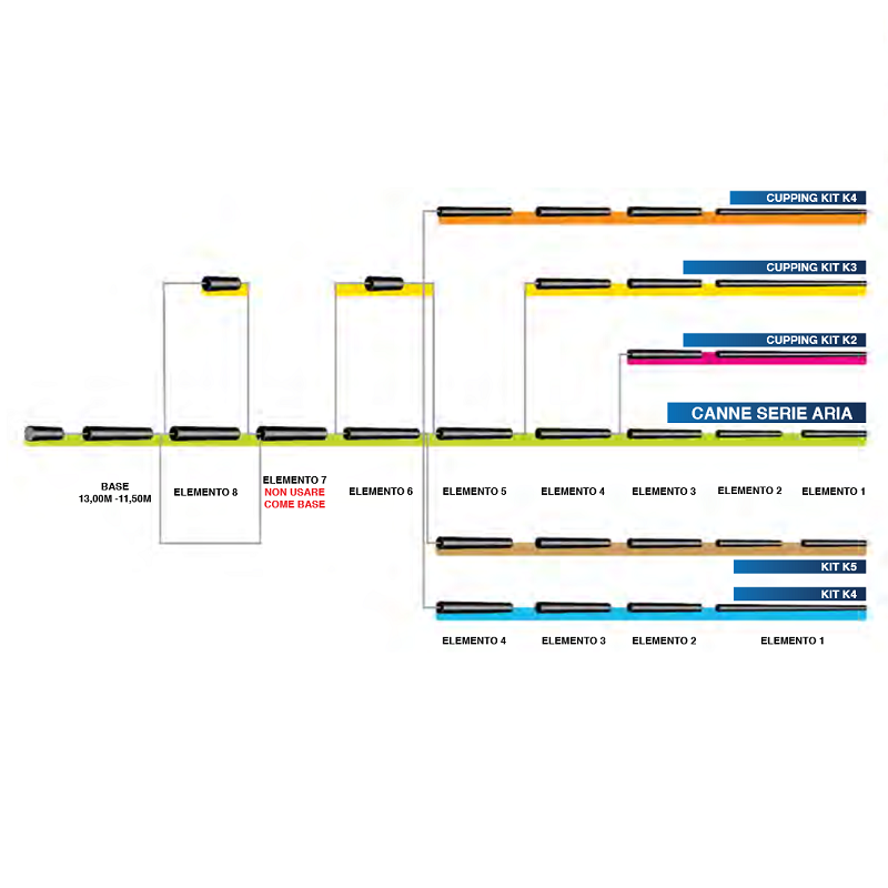 Italica са разработили широка гама топ комплекти за щеките си, както мачови, така и шарански, за да покрият всички нужди, с две конкретни цели: първата е да предложат персонализиране на щеката Ви и да изберат техническото решение, което най-добре отговаря на дадения вид риболов. Второто е да направят всеки модел щека по - универсален, тъй като чрез смяна на топ кита можете да преминете от един вид риболов към корено различен тип риболов. Поради тази причина всички комплекти, както мачовите, така и шаранските, са произведени с еднакъв размер и следователно са напълно взаимозаменяеми и приложими за всички модели щеки на фирмата. В допълнение към стандартните модел се предлагат и къпинг комплекти. Произвеждат се в широк спектър окомплектовки и ценови диапазони.