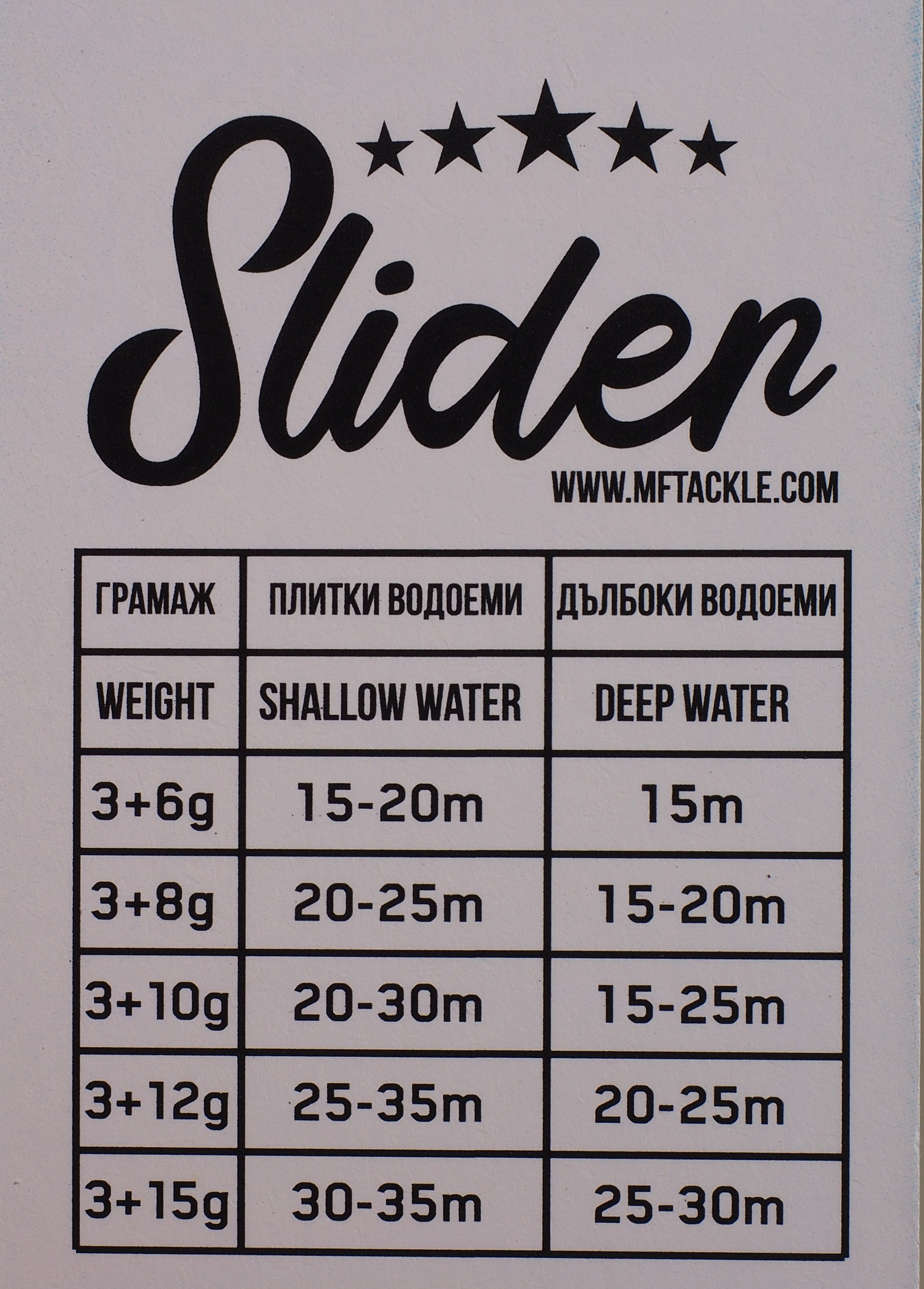 Подвижна плувка тип "слайдер" за риболов на по големи дълбочини или в по силно течение. Изключително стабилна и чувствителна. Тялото е изработено от специален материал, който не "пие" вода дори и да е наранено или спукано. Главата е с регулируеми шайби и вграден вирбел чрез който прикрепяте слайдера към линията си. Препоръчваме при риболов с MF Slider , основната ви линия да е между 0.20мм и 0.24мм. Четирите слоя боя заздравяват още повече  MF Slider. Стеблото е направено от карбон, за по голяма чувствителност .
